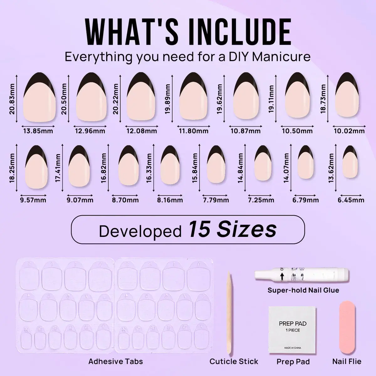 - Includes 32 tip nails, nail glue, nail file, alcohol pad, adhesive tabs,and nail removing/cuticle pusher tool