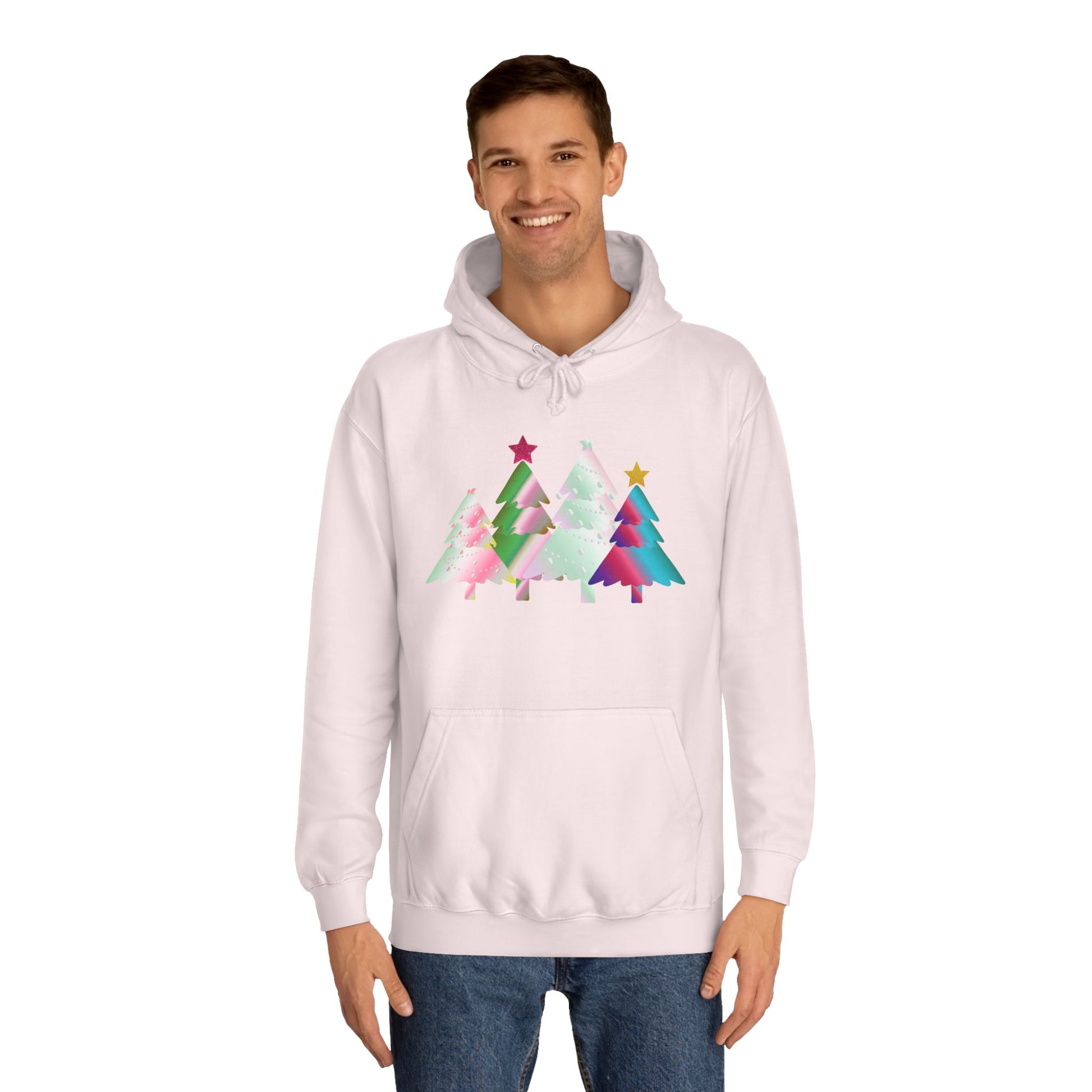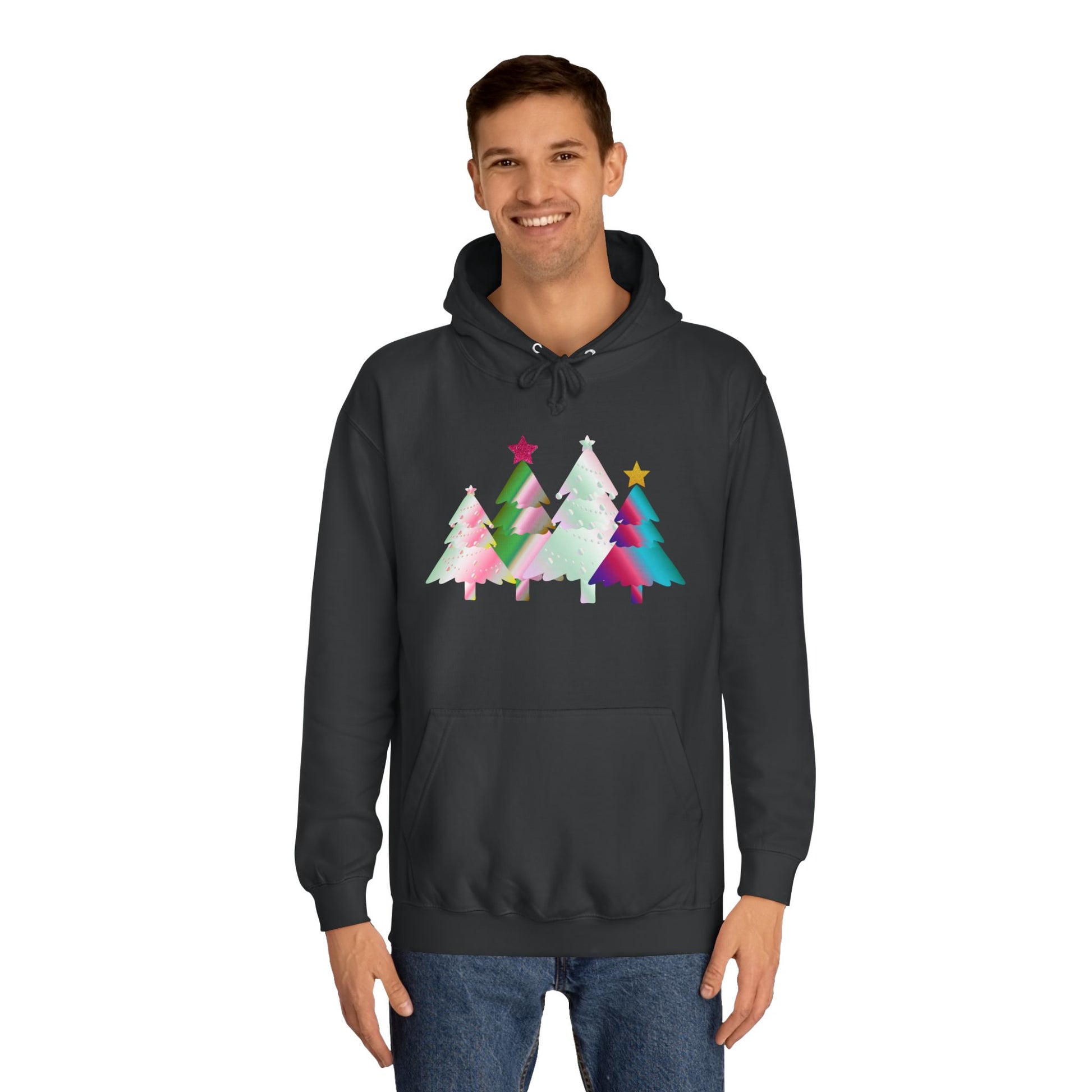 This colorful holiday-themed hoodie with festive Christmas trees gives off a cheerful and cozy vibe, perfect for the winter season. It is ideal for anyone looking to stay warm and festive during the holiday celebrations.