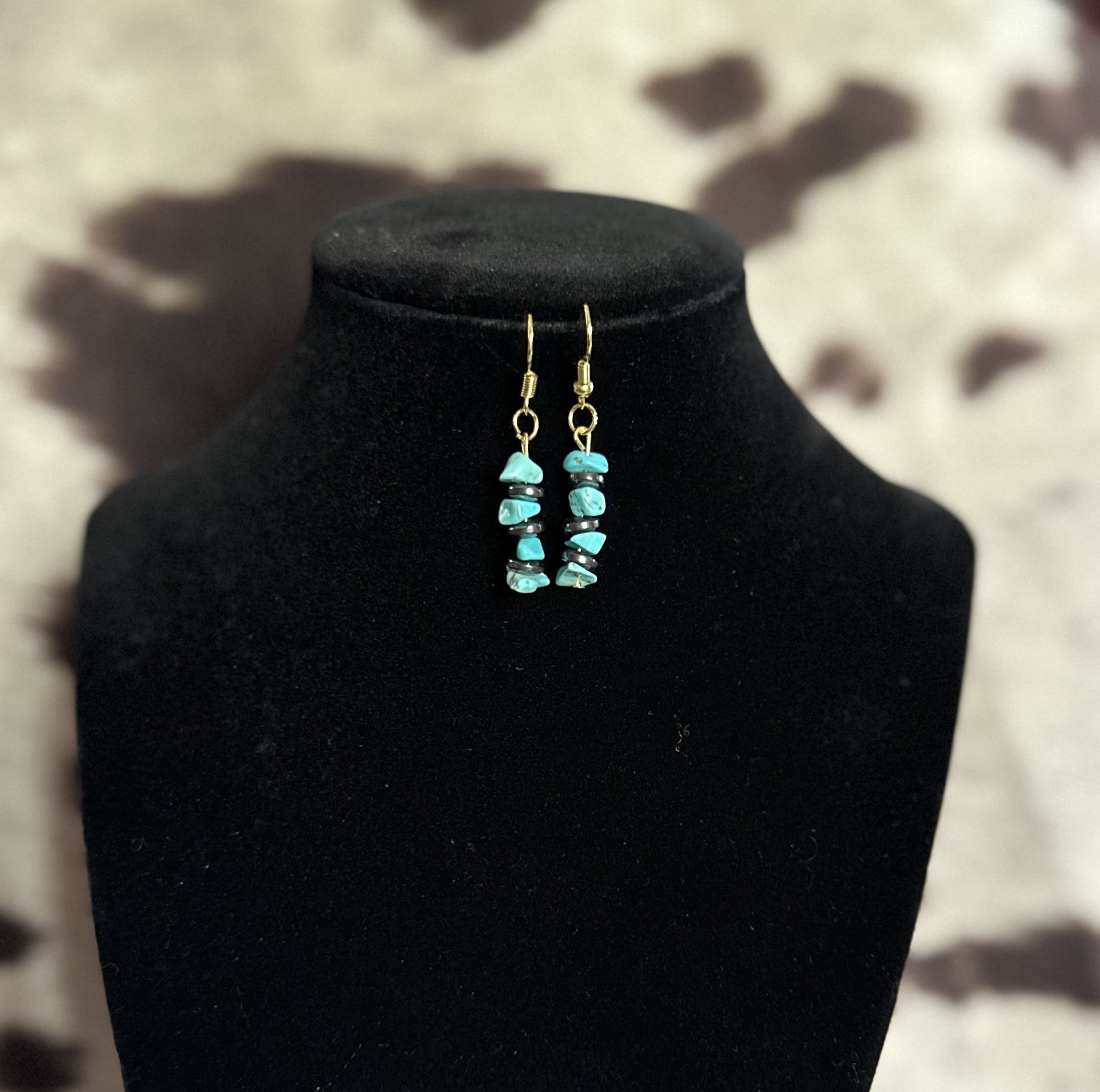 Inspired by the rugged beauty of the desert in full bloom, these Desert Bloom earrings capture the wild spirit of the Southwest. Featuring stacks of natural turquoise stones with delicate gold accents, these earrings bring a pop of color and rustic charm to any look.