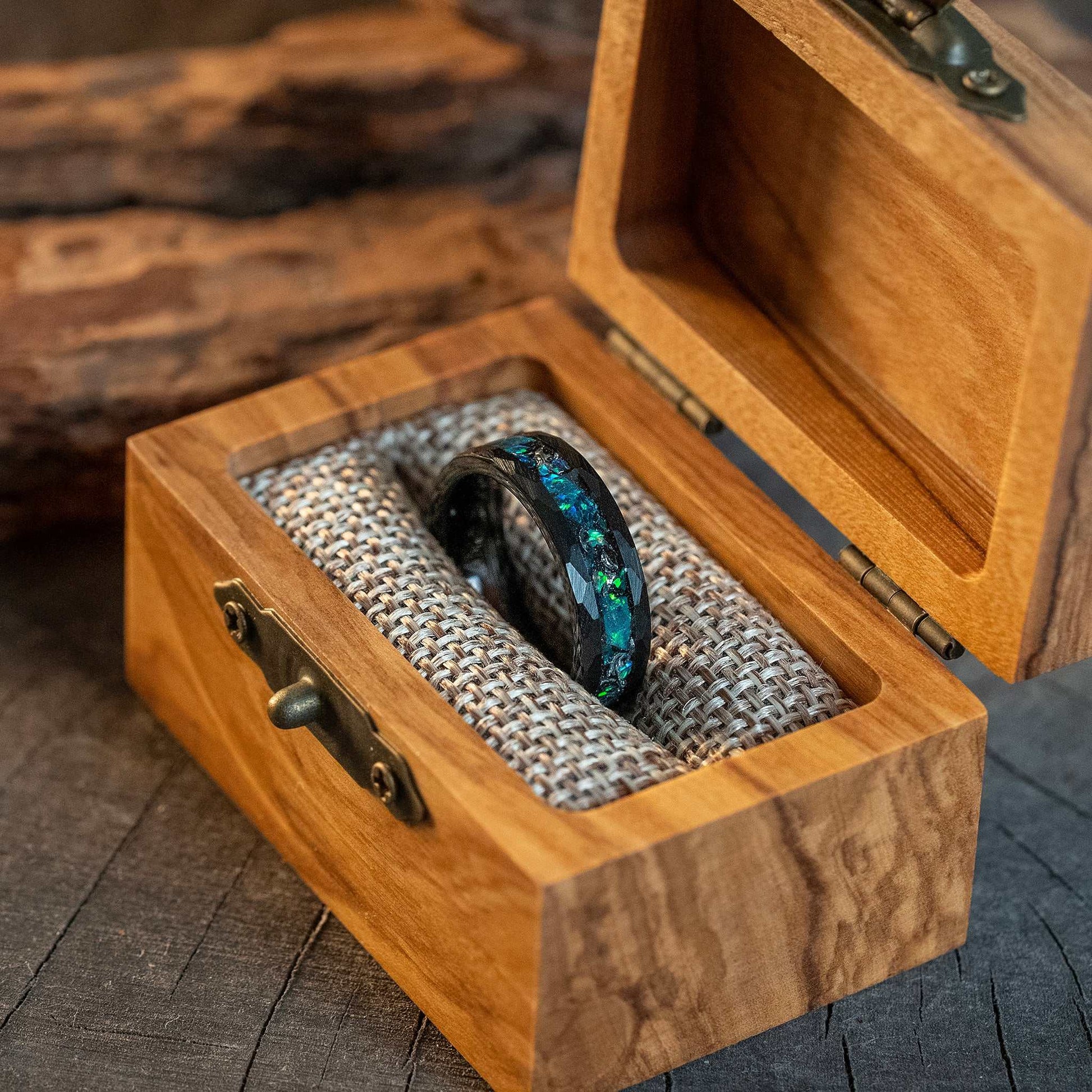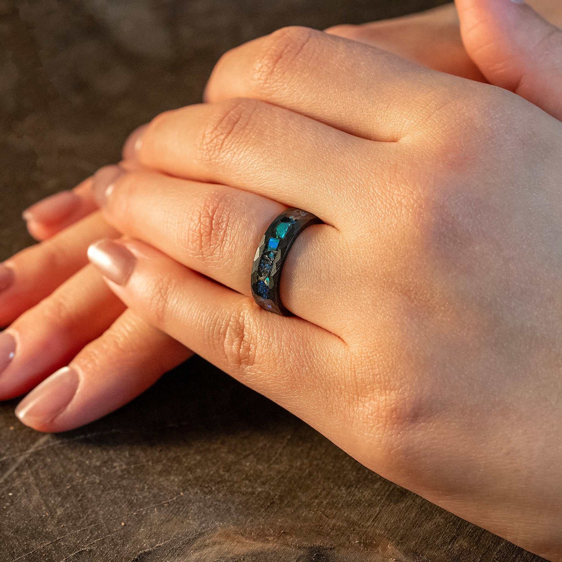Green Opal x Meteorite Black Hammered Tungsten Carbide Ring - 6mm