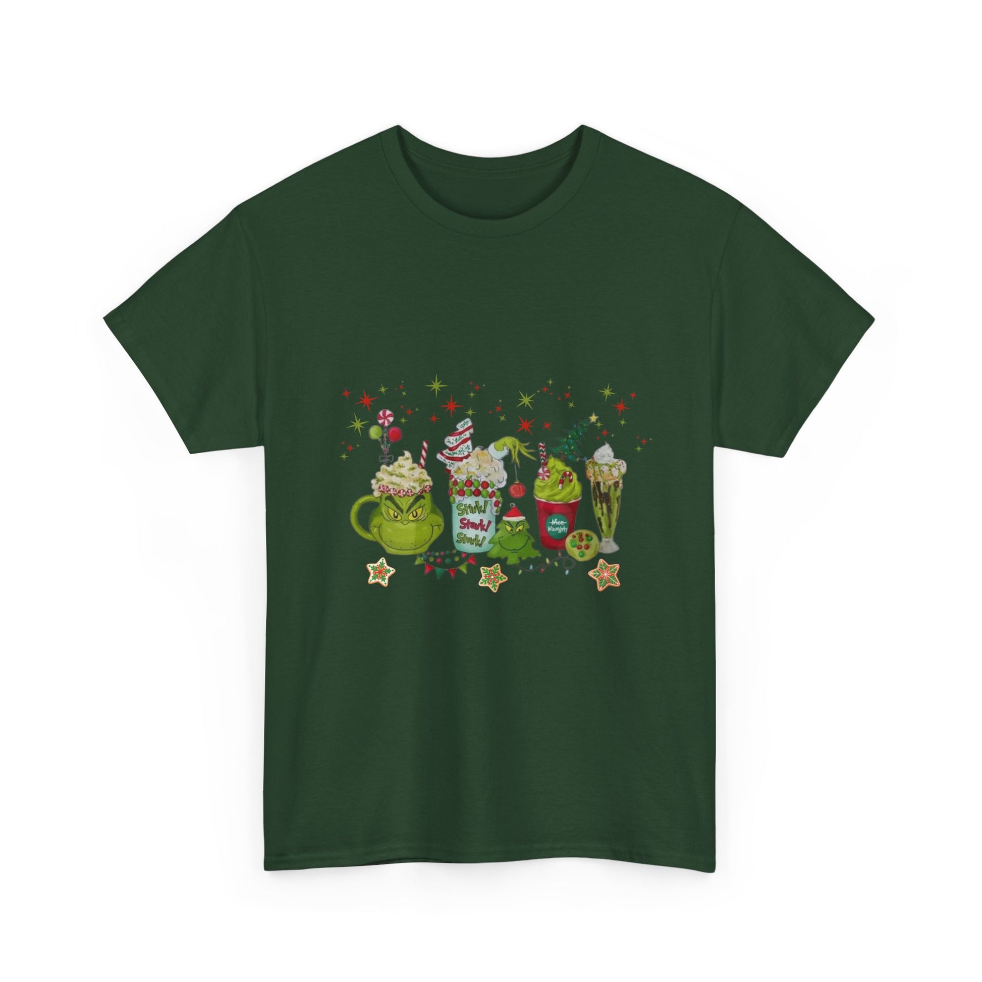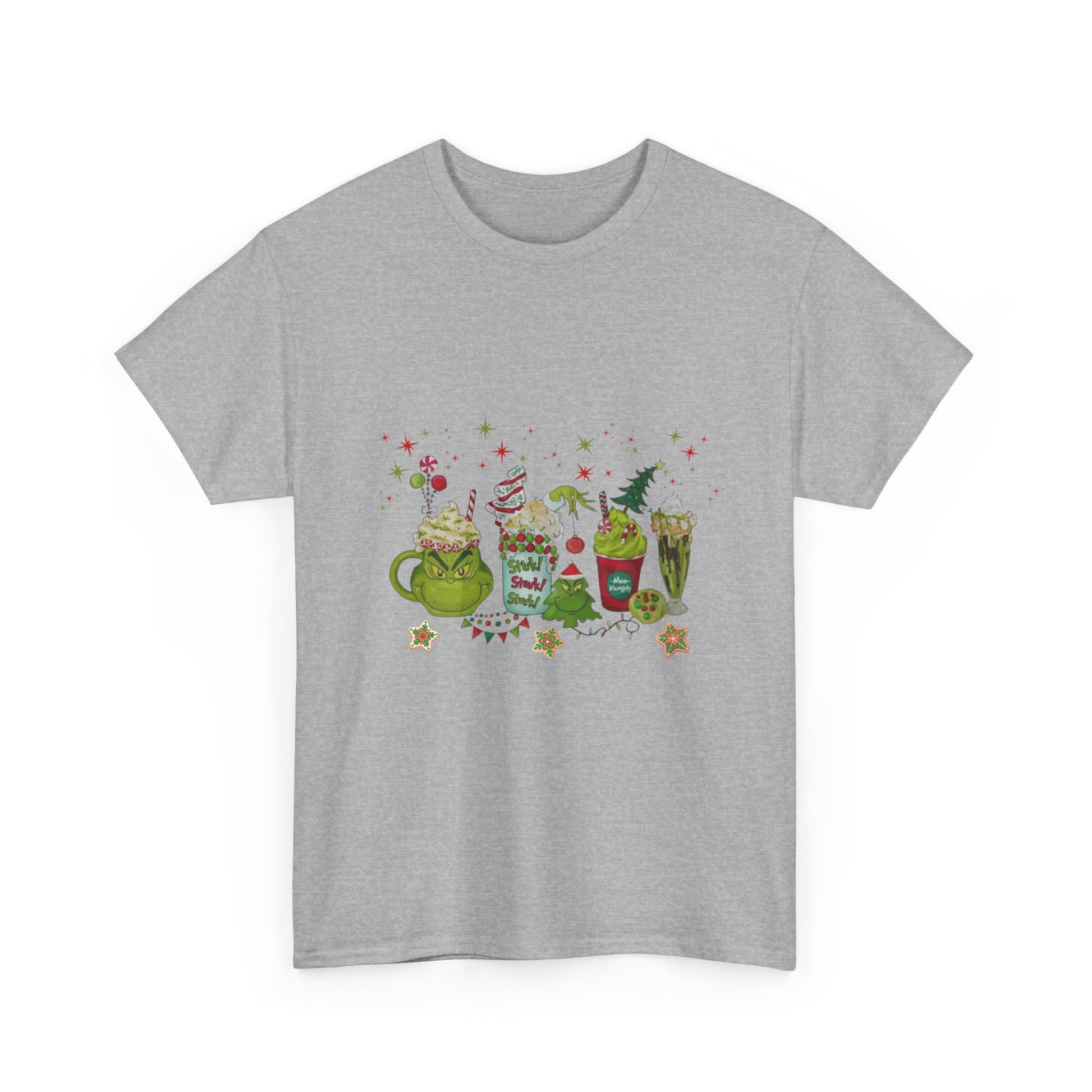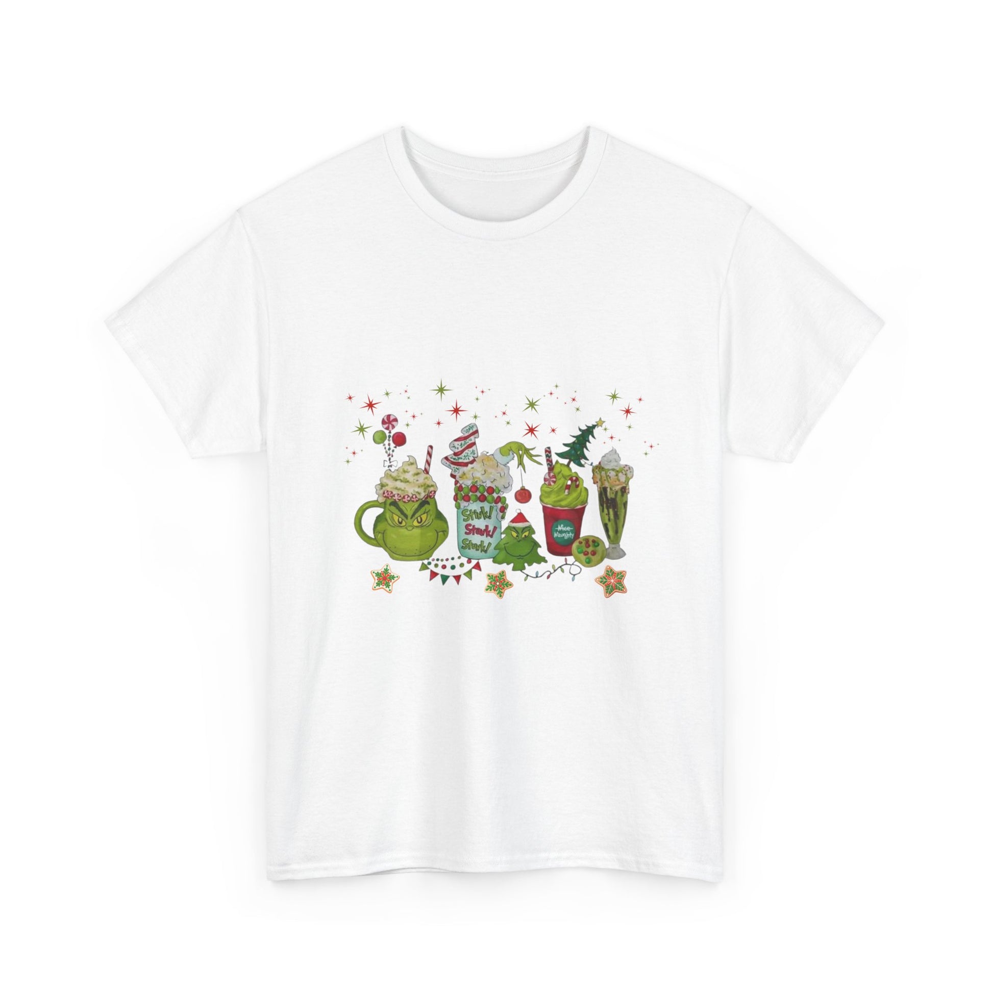 A Grinchy holiday-themed tee perfect for Christmas fanatics who love sipping cocoa, coffee, and enjoying peppermint and cookies. This unisex heavy cotton tee exudes a cozy and festive vibe, making it ideal for wearing during the holiday season or as a fun gift for loved ones.
