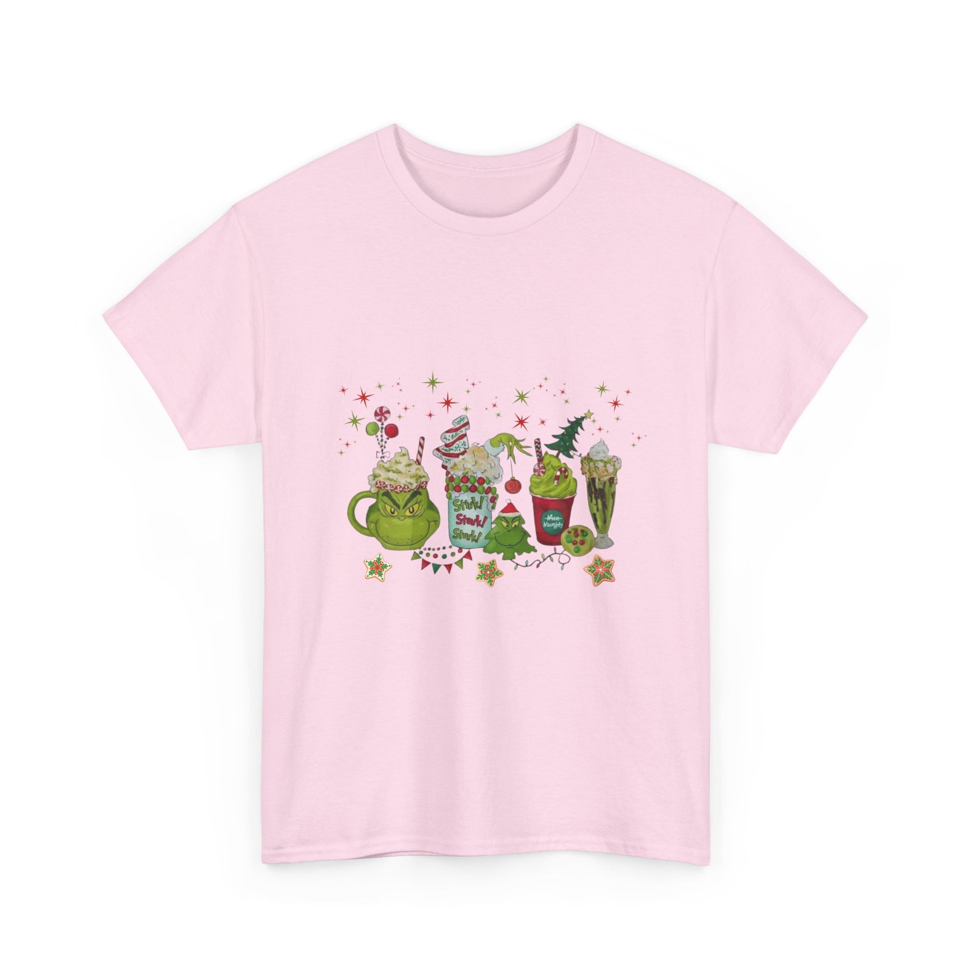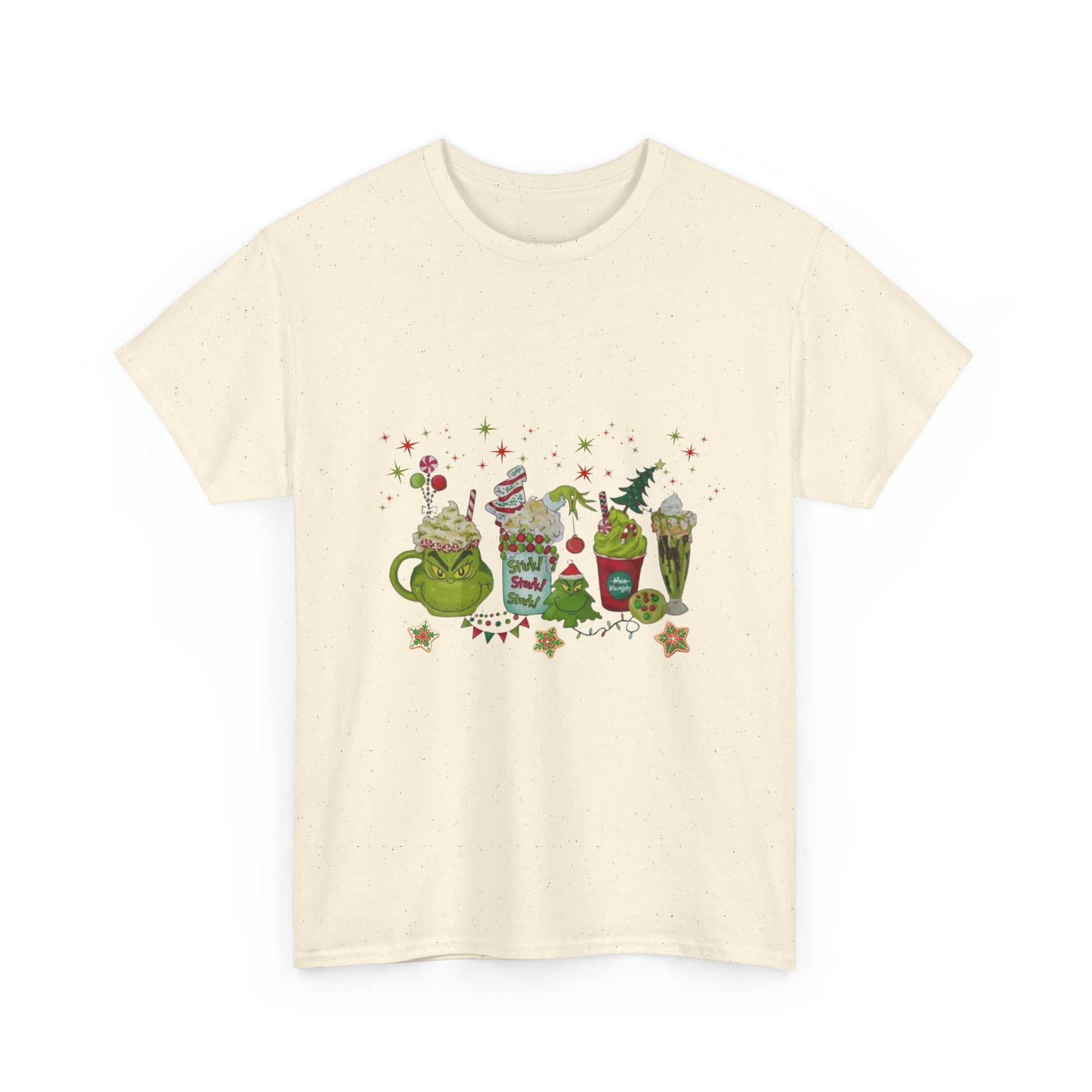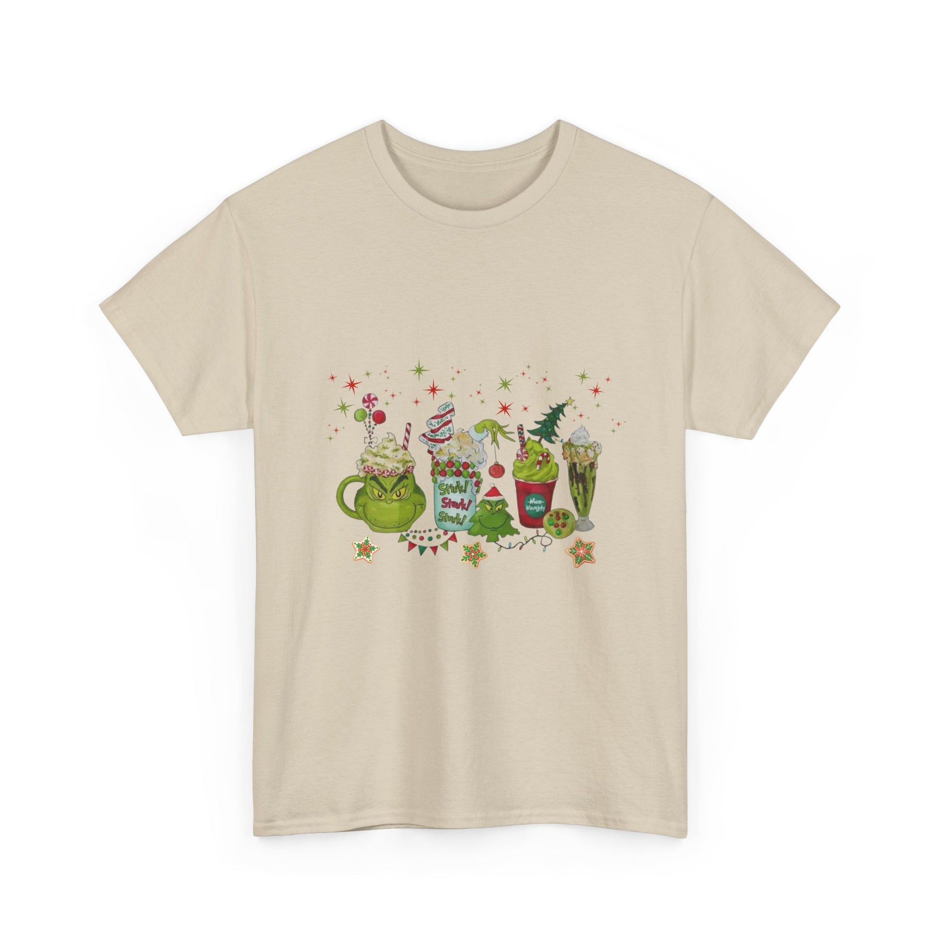 A Grinchy holiday-themed tee perfect for Christmas fanatics who love sipping cocoa, coffee, and enjoying peppermint and cookies. This unisex heavy cotton tee exudes a cozy and festive vibe, making it ideal for wearing during the holiday season or as a fun gift for loved ones.