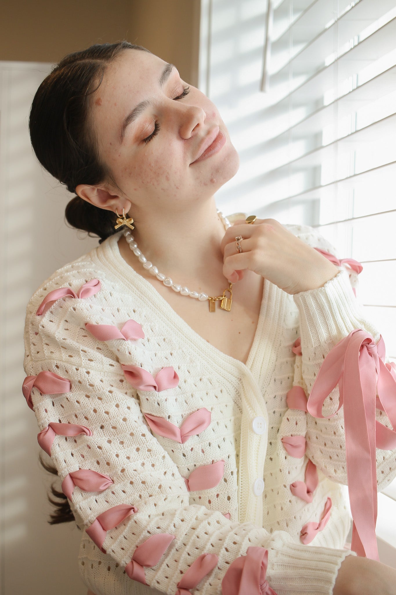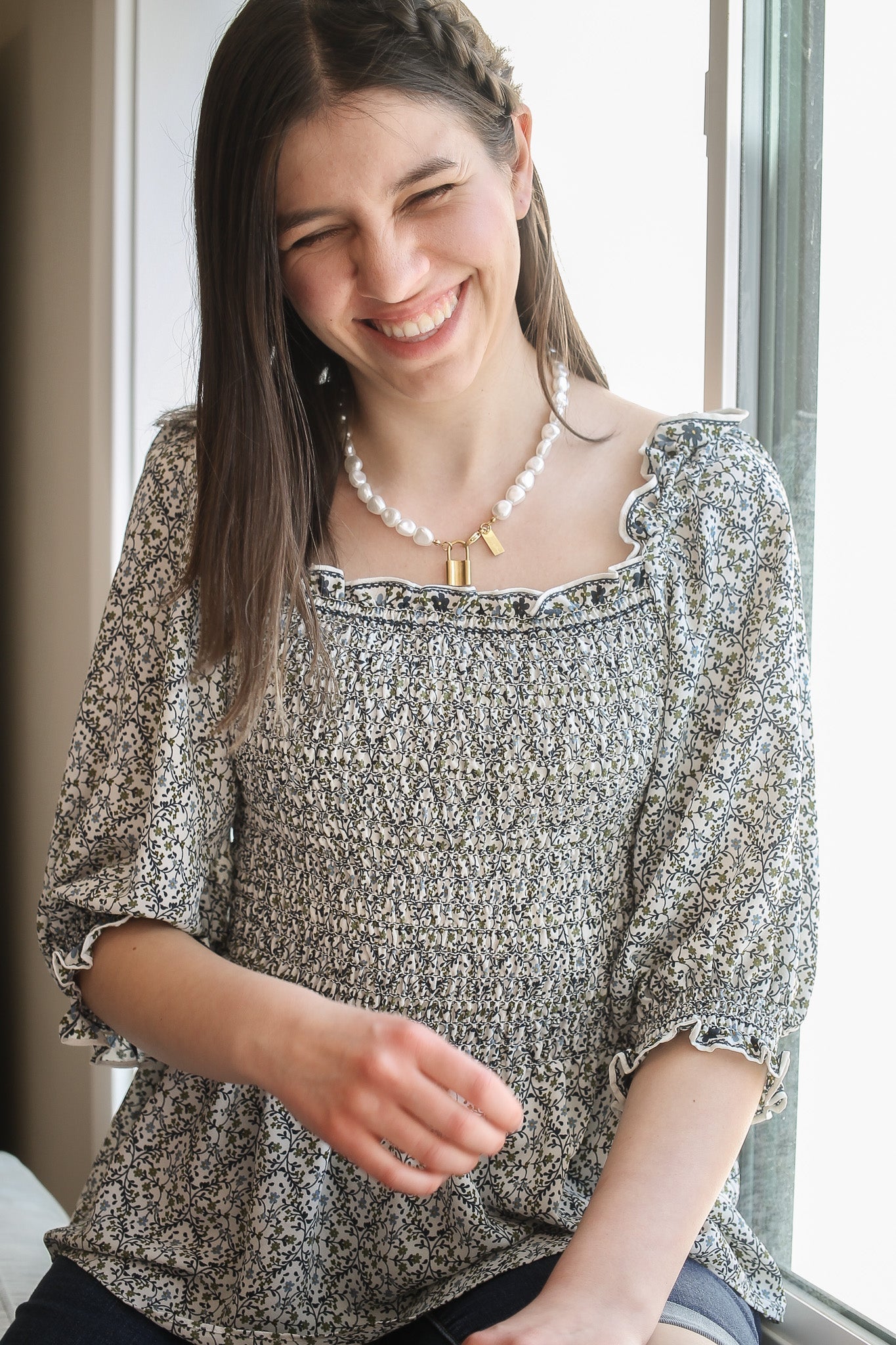 A custom Rose and Clay design! This necklace is intended to be worn with the lock at the front, but you could also flip lock and clasp to the back so you have just a simple classy pearl necklace!! How cute :)