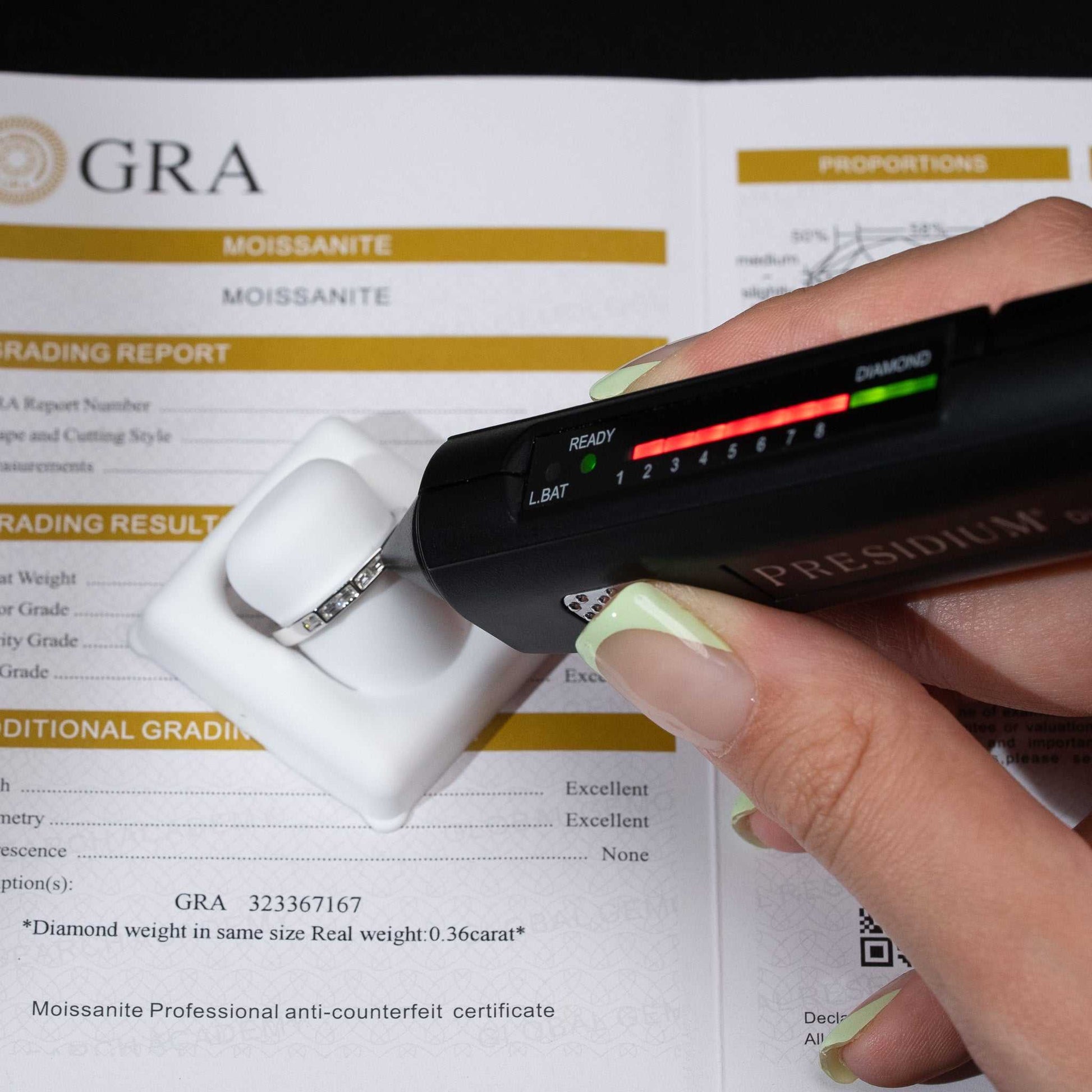 - Total Carat Weight: 0.36 carat moissanite (VVS1, D color)