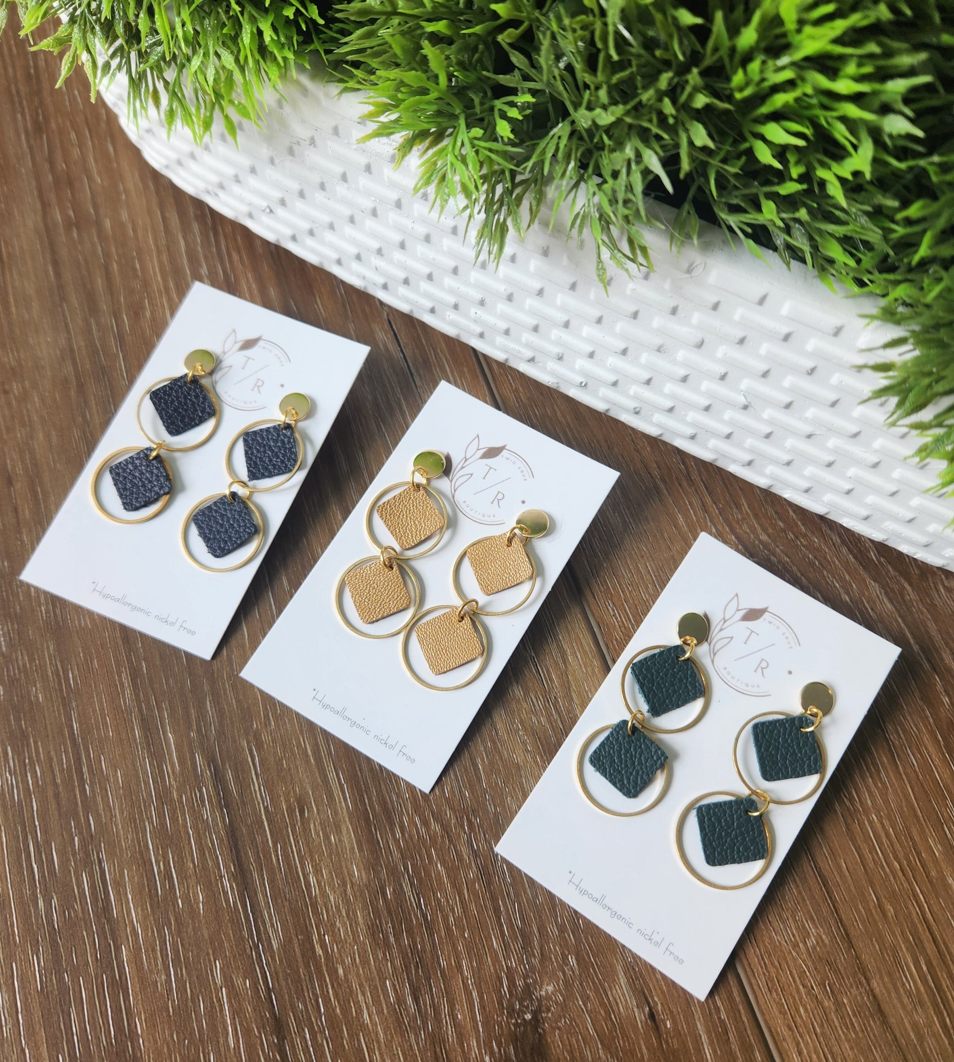 Italian genuine leather with brass make an elegant statement earring. Lightweight, hypoallergenic, and nickel free. Stainless steel gold posts.