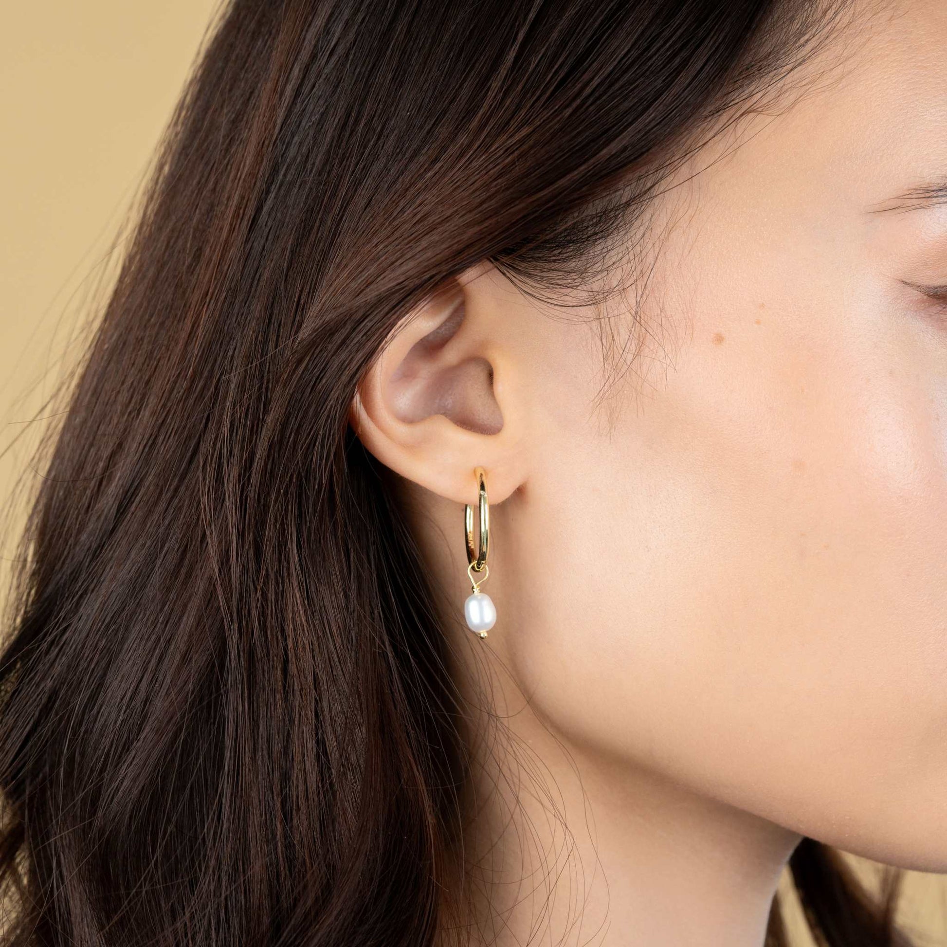 Hear the call of luxury with these gold huggie hoop earrings, featuring a natural freshwater pearl charm that elevates your style. The radiant glow of the freshwater pearl pairs perfectly with the opulent gold texture, making these huggie hoops a must-have for jewelry lovers. Due to the unique nature of freshwater pearls, slight variations in color and shape may occur, adding to their one-of-a-kind charm.