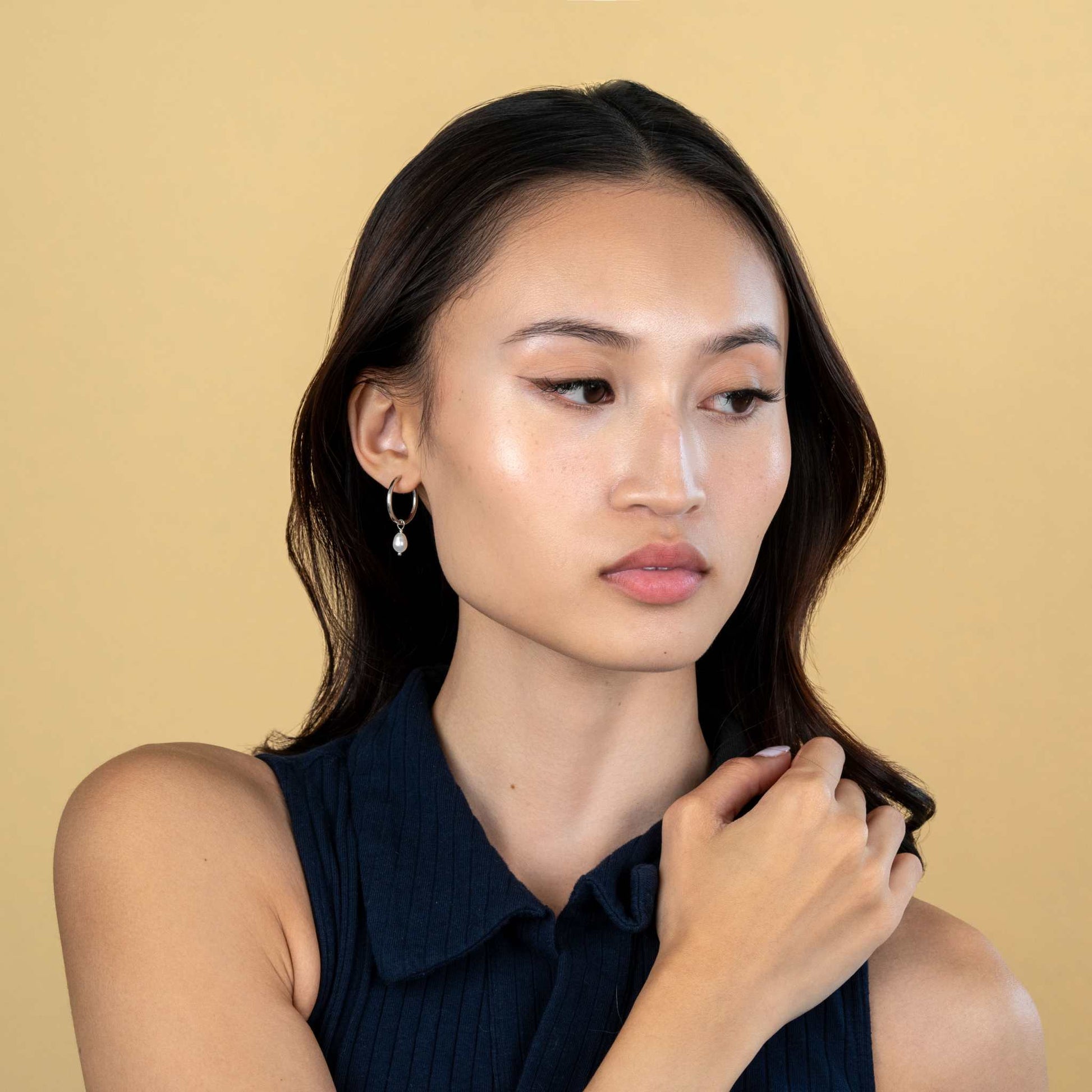 Perfect for any occasion, these earrings blend sophistication and versatility. Available in a silver finish (925 Sterling Silver) or gold finish (14K Gold over Brass), they’re designed to hug your ears comfortably at 16mm, with a pearl charm measuring approximately 5.8mm x 7mm.