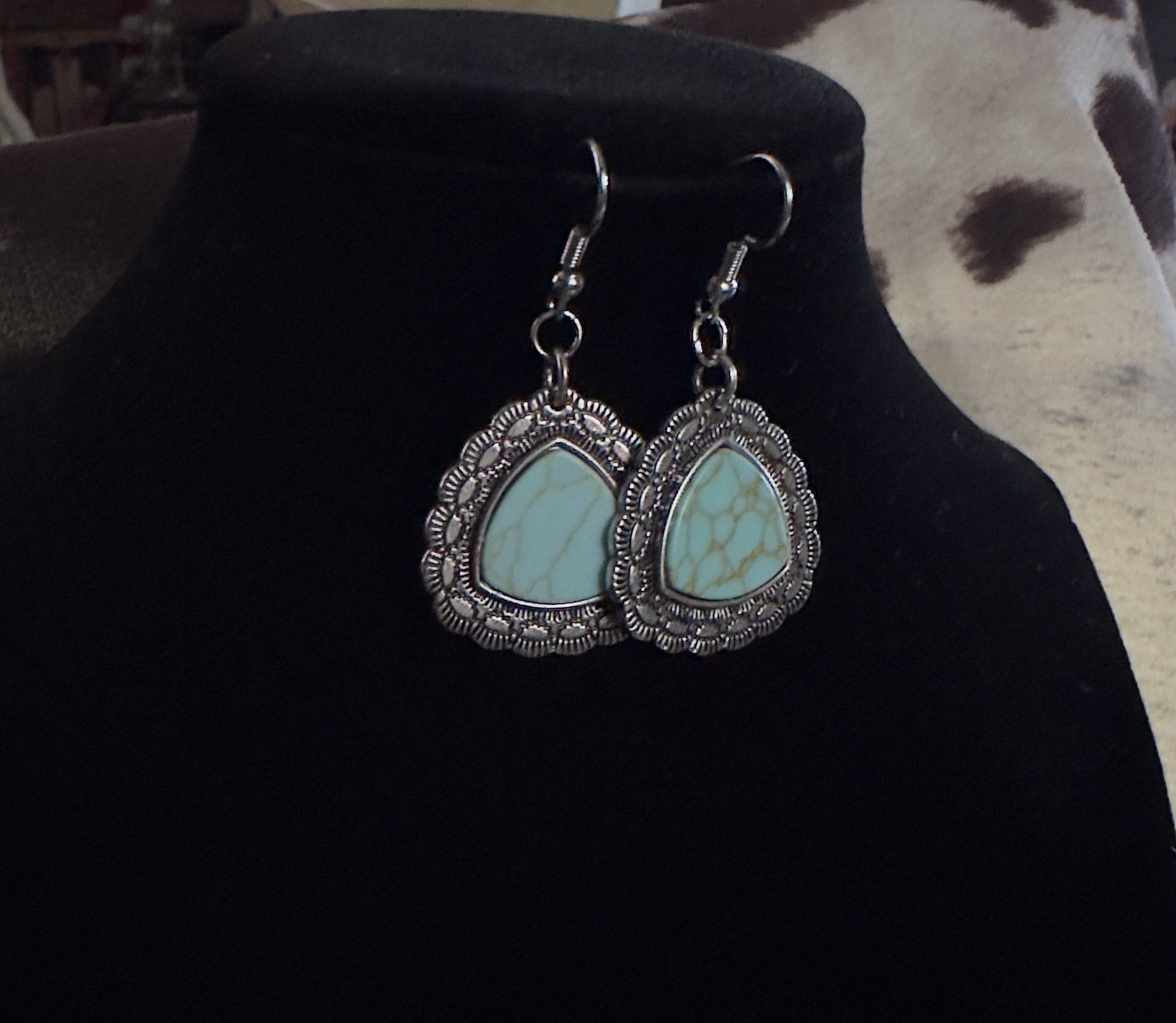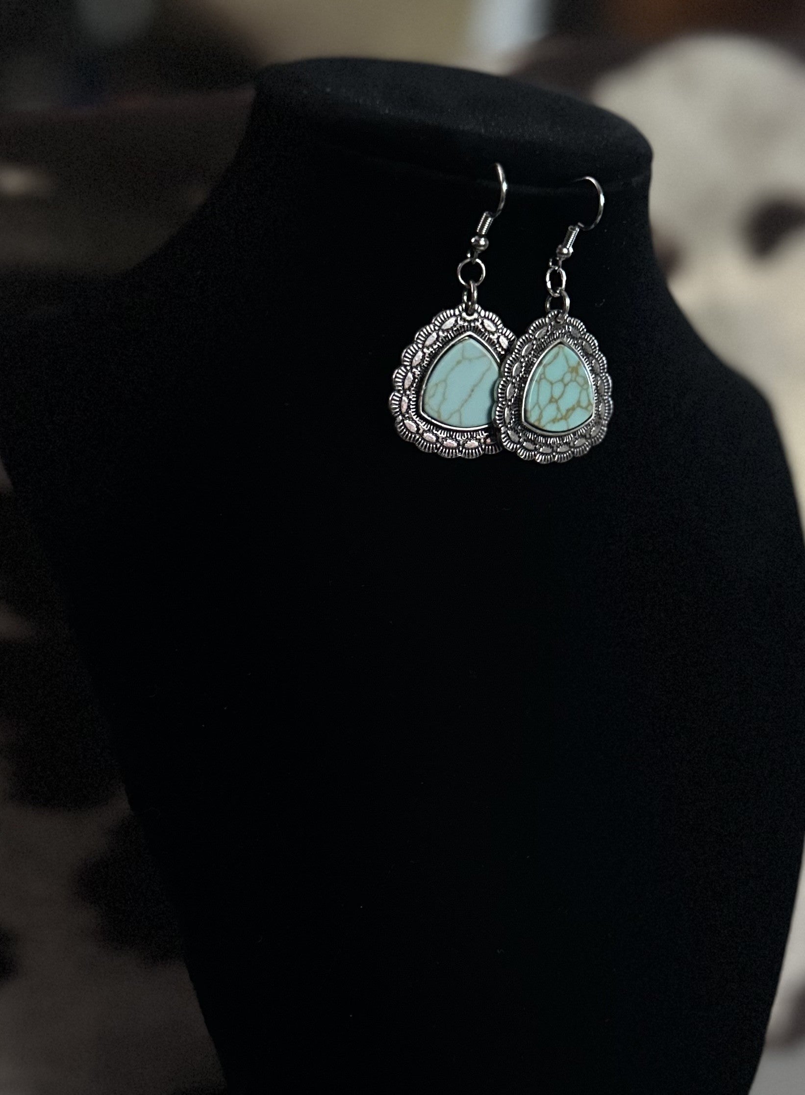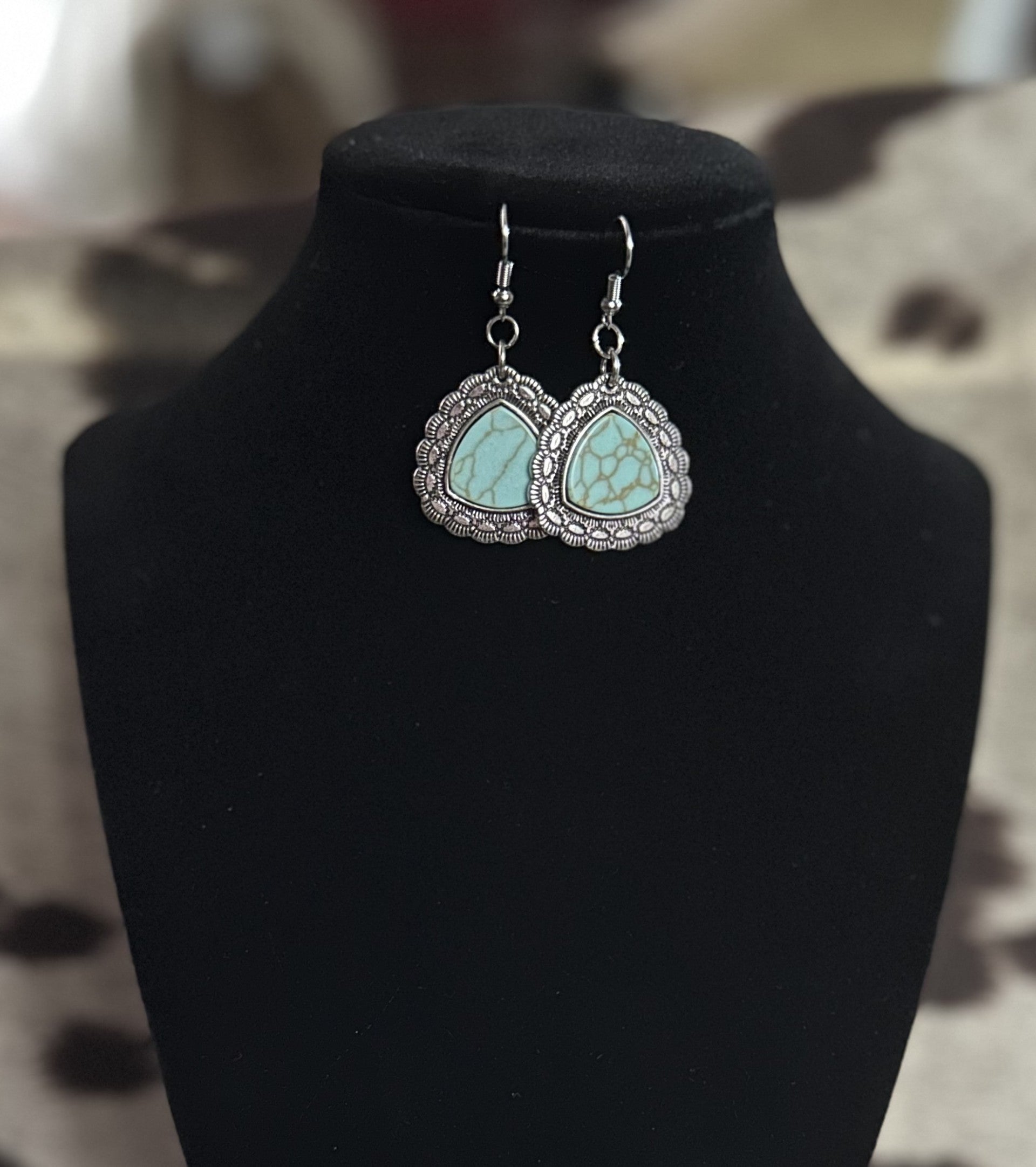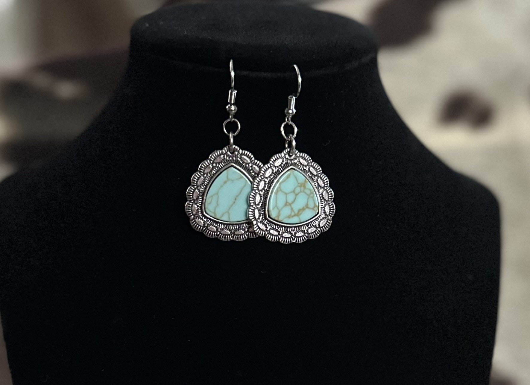Add a touch of southwestern charm with the Sagebrush Glow Earrings. Featuring bold, large turquoise stones, these earrings capture the untamed beauty of the western landscape. Paired with silver earwires, they bring an effortlessly stylish statement to any outfit, whether you’re out on the ranch or out on the town.