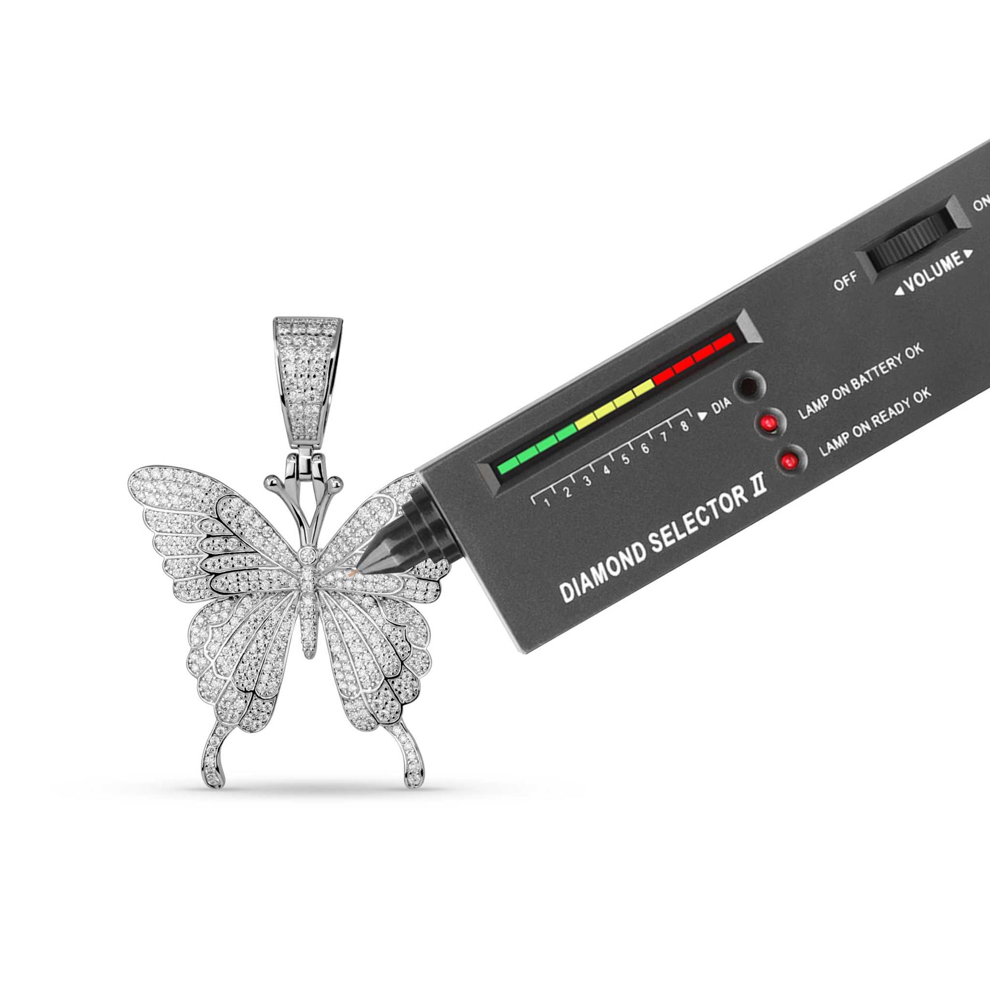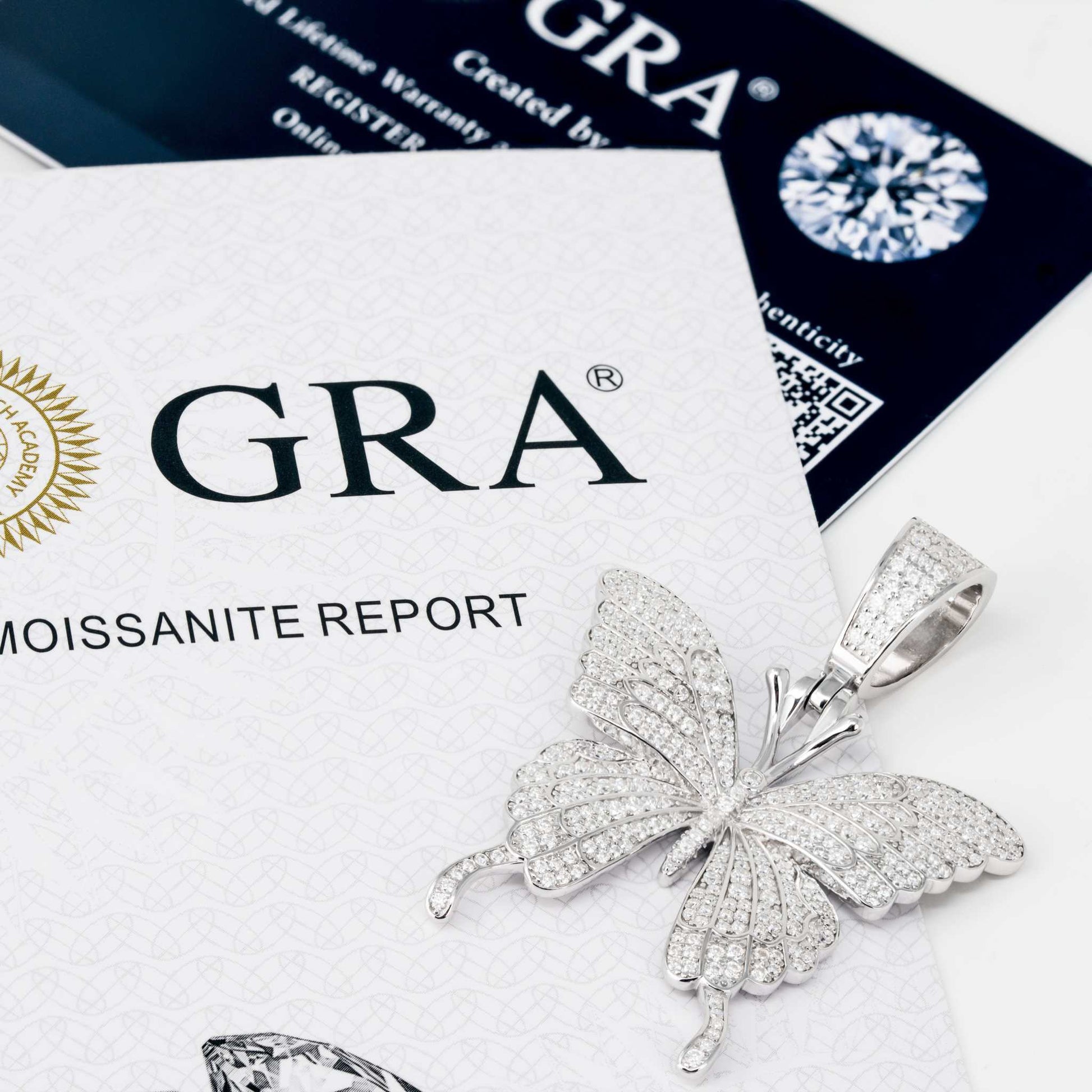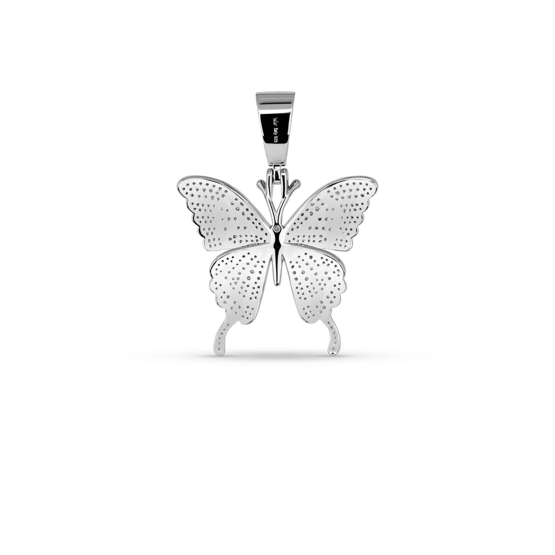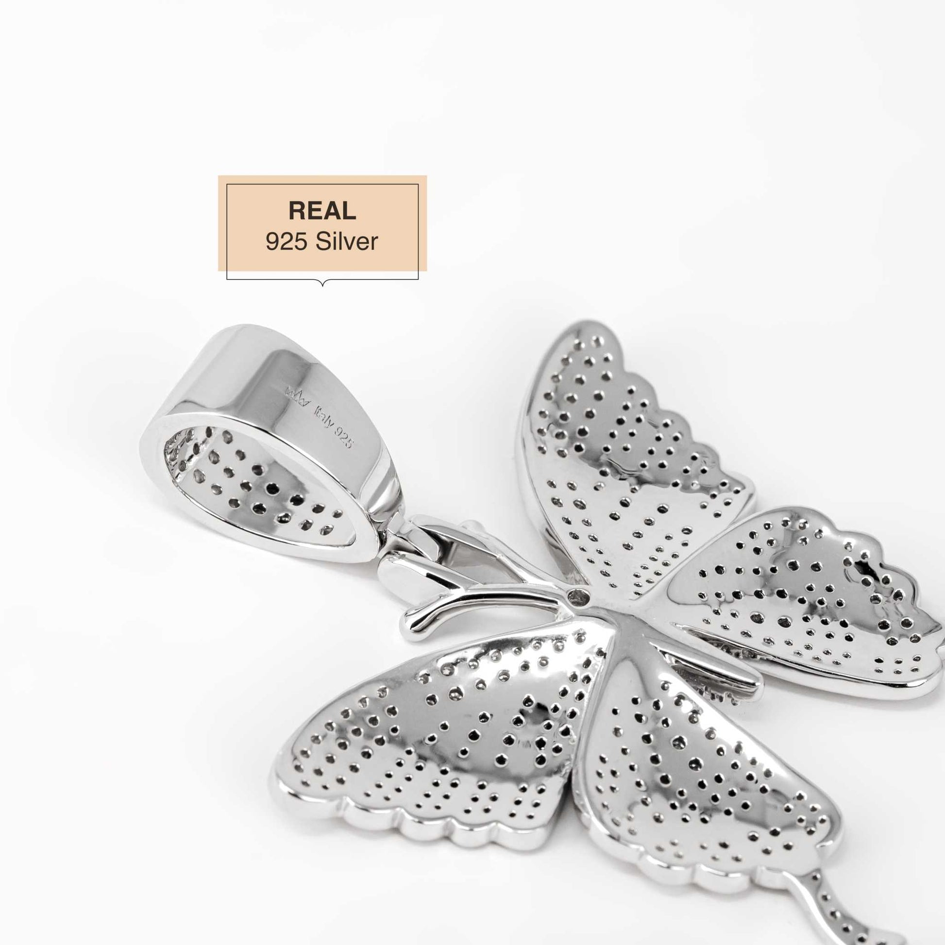 Crafted from high-quality 925 sterling silver, this necklace features a stunning lab-created moissanite stone in a butterfly shape, surrounded by pave-set moissanite stones. The necklace has a hip-hop theme and is perfect for women who want to add some bling to their style. The pendant has a total carat weight of 2.58 TCW. The necklace has a charming style and is suitable for any occasion. It is an ideal gift for someone special or a perfect addition to your jewelry collection. So, if you want to make a statement with your style, this necklace is the perfect choice for you. Perfect with tennis chains!